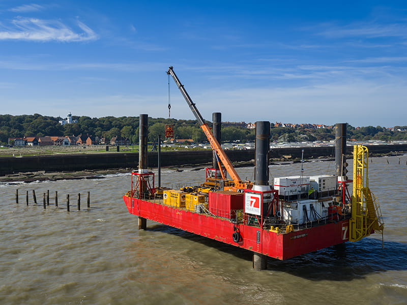 Both the navigation markers and a bespoke piling gate, designed specifically for the installation of the 406mm diameter tubes, were fabricated in-house by our skilled team in Ipswich.