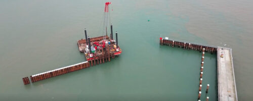 Our Haven Seajack 3 jack-up barge was floated into position which the Mackley s team then used as a stable platform from which to install a new flood defence wall made of steel sheet piles along the River Road stretch